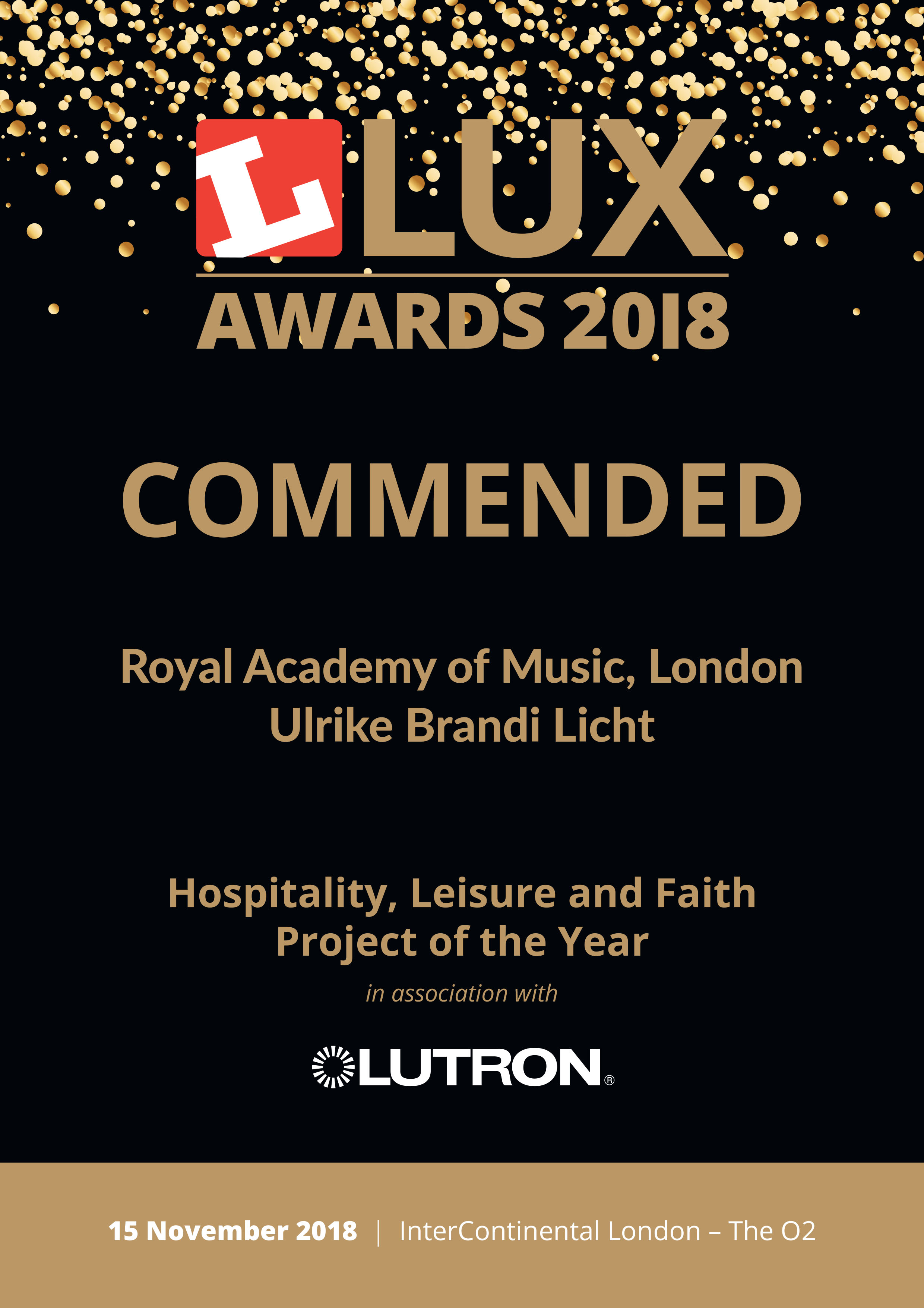 Designed in collaboration with the Hamburg-based lighting designer Ulrike Brandi Licht, we are pleased to announce that the lighting at The Royal Academy of Music’s Susie Sainsbury Theatre has received a commendation in the ‘Hospitality, Leisure and Faith Project of the Year’ category at the LUX Awards 2018.