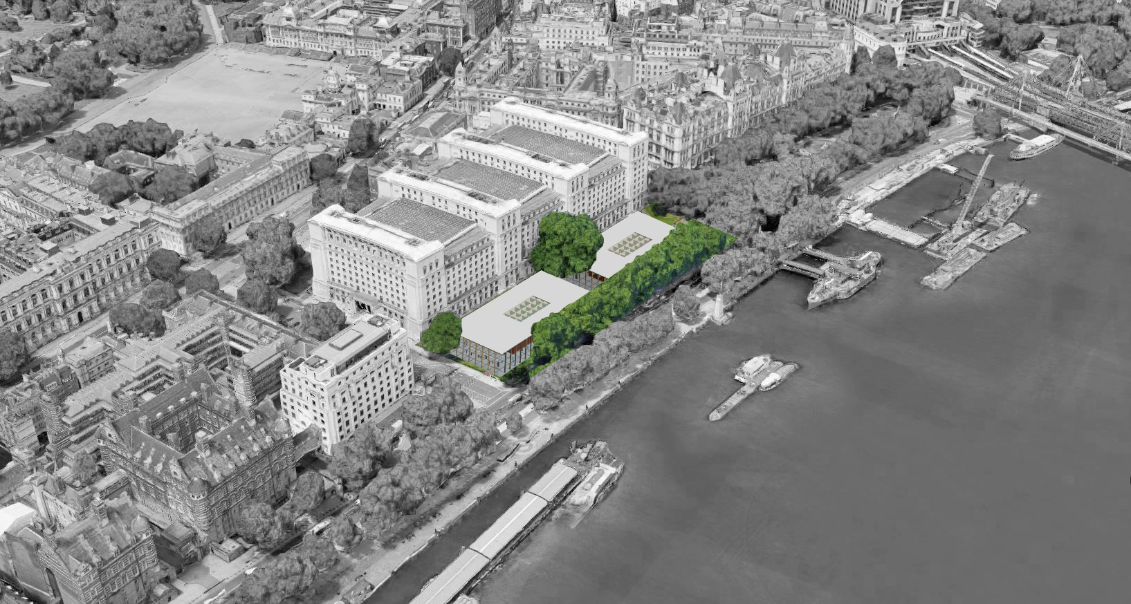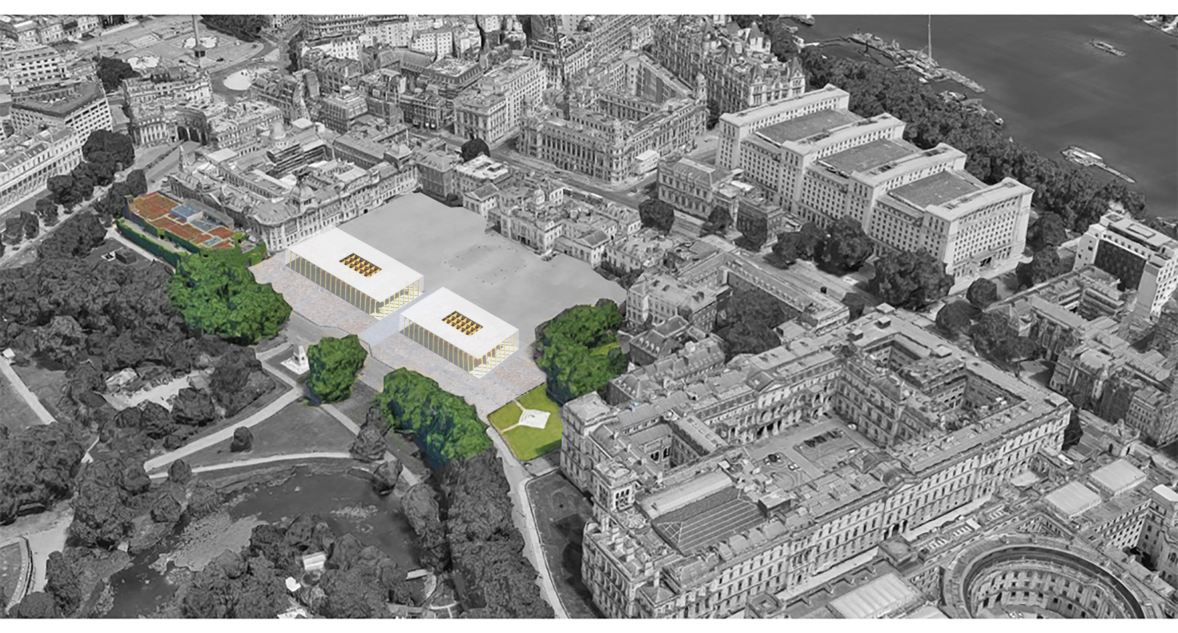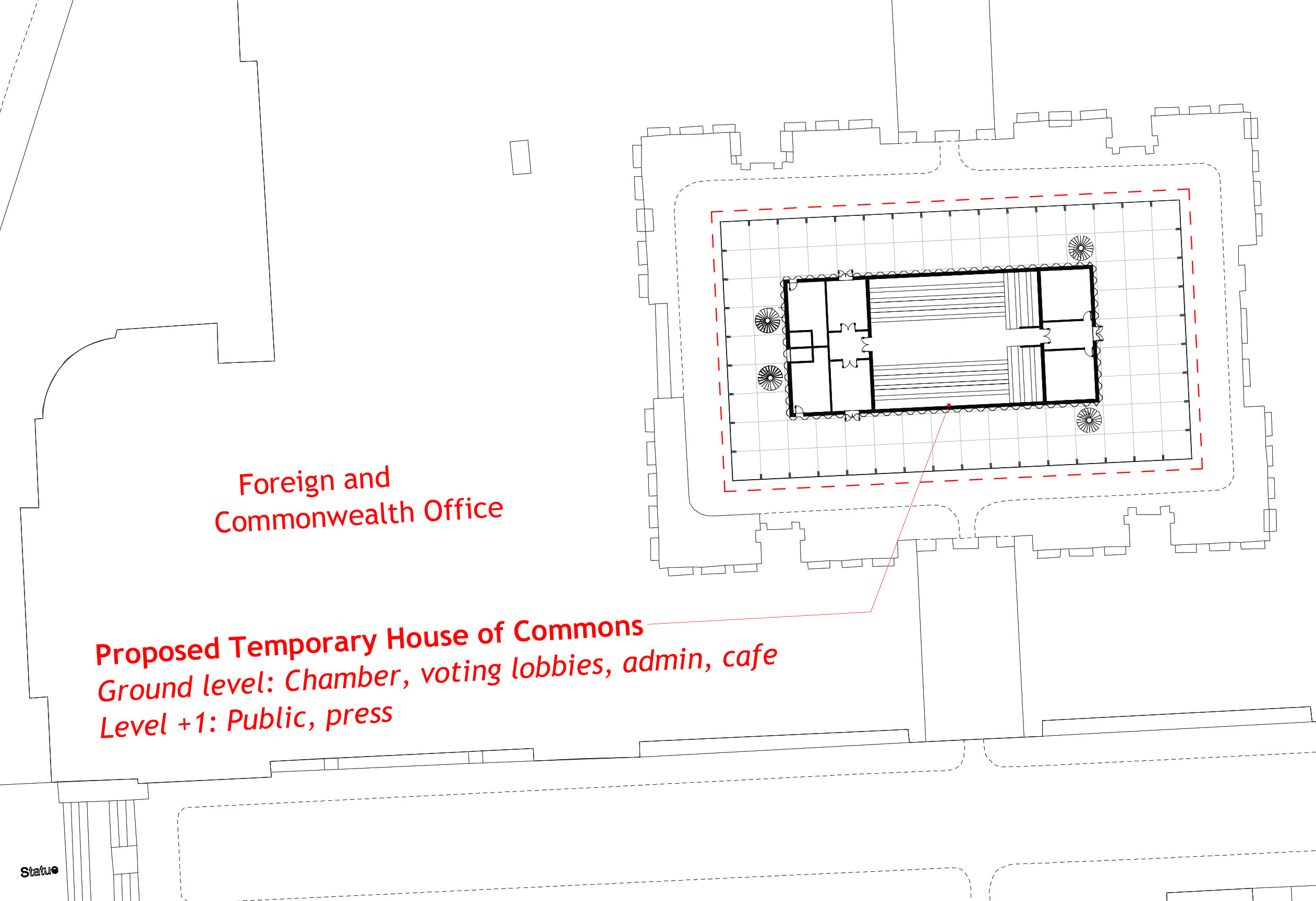 Our drawings show the concept illustrated in three different potential locations; the House of Commons and House of Lords placed in Whitehall Gardens in front of the MOD building; a view of the same buildings on Horse Guards Parade; and in the FCO Courtyard (the Commons), and the Treasury’s Courtyard (the Lords).