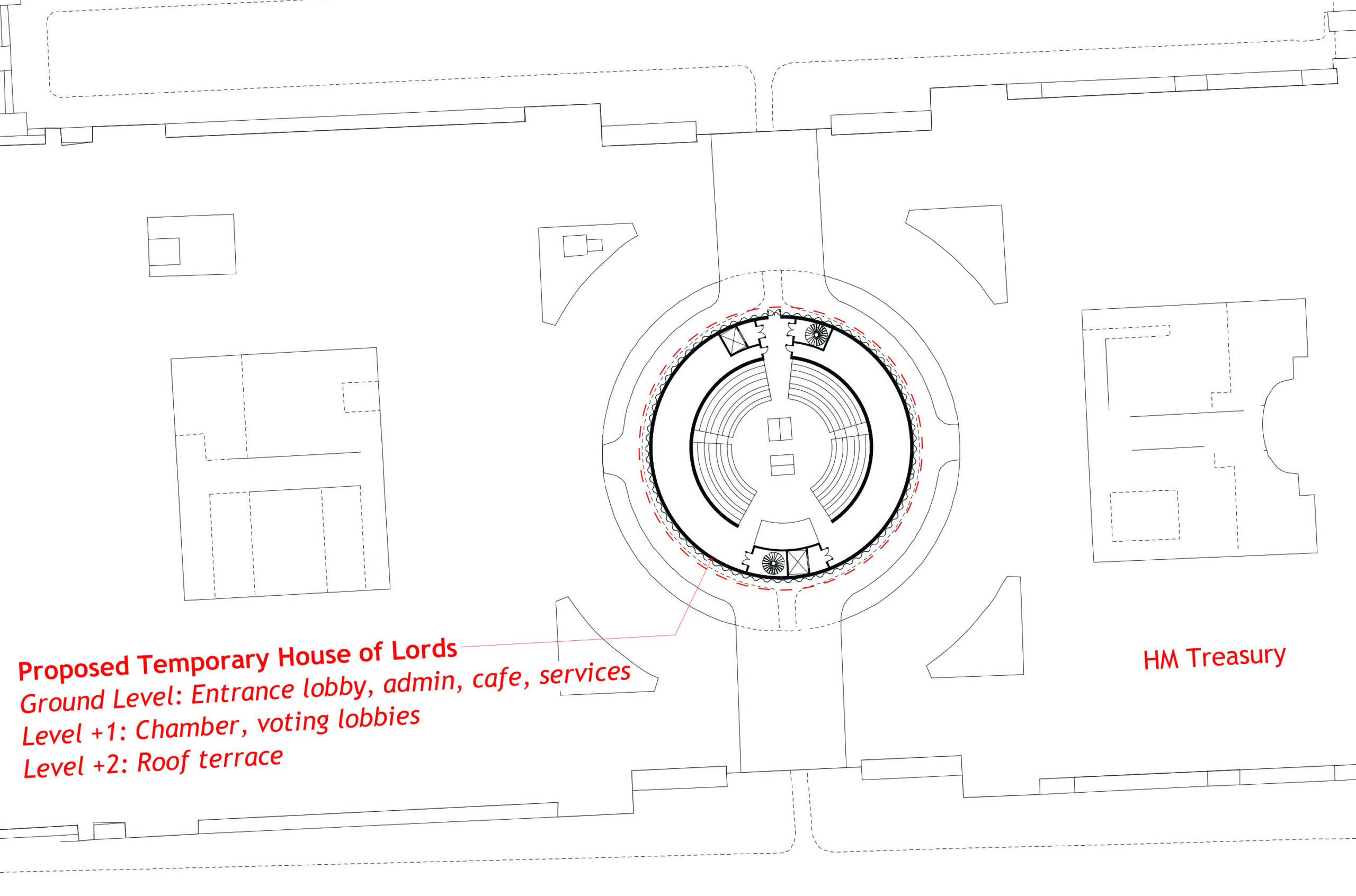 Ian Ritchie Architects concept for temporarily housing the Chambers of the House of Lords and House of Commons is a radical, economic, secure, and elegant solution for both Chambers with ancillary accommodation which would cost £55 million including design fees and a 20% contingency.