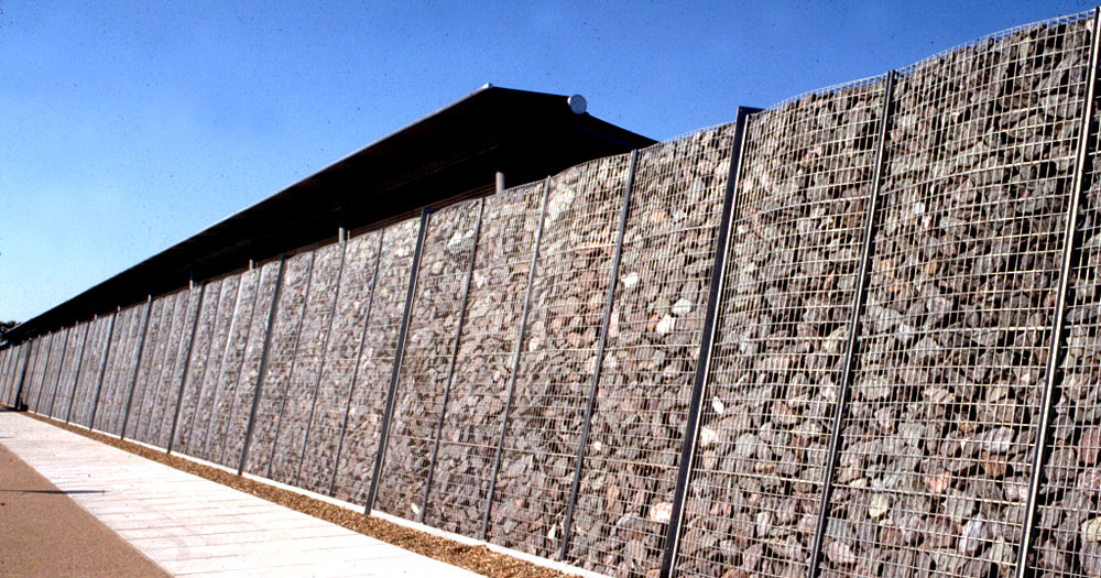 In this scheme the walls are used to define spaces within which the buildings can nest and create landscape statements in their own right. In the case of the boathouse, the building is defined only by the free standing gabion walls and a lightweight stiffened catenary stainless steel sheet roof.
