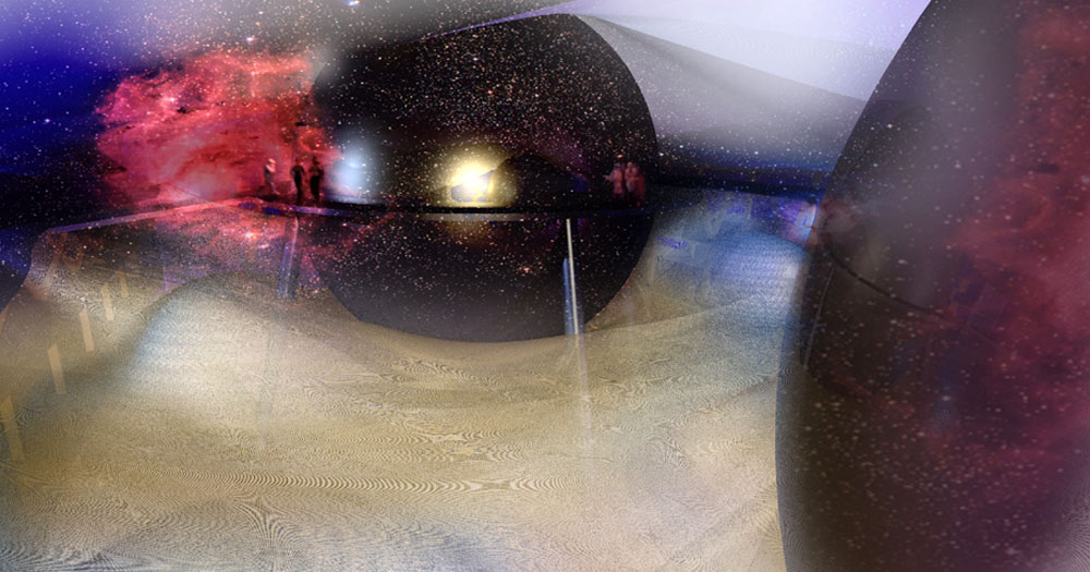 The architectural concept is based upon a number of spheres and hemispheres below, upon and above a ground plane. These house immersive theatres whose historical, contemporary and future astronomical performances will be specifically created by a state of the art combination of computer simulation and multi-media techniques.